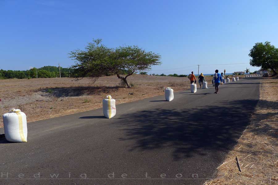Farmers, after puttng the dried grains back in the sacks.